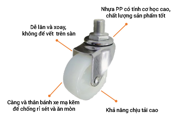 Càng và thân bánh xe mạ kẽm để chống rỉ sét và ăn mòn, giúp bề mặt luôn bóng đẹp.