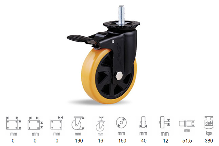 Bánh xe PU dòng 290 tải trọng trung bình trục xoay có thắng Ethos 296UMH150T16