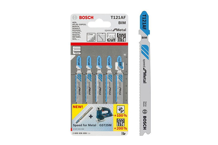 Bộ 5 lưỡi cưa lọng cho sắt T121 AF - 2608636699 dùng để cắt kim loại. Lưỡi cưa được thiết kế sắc bén, khi vận hành cùng với tốc độ và công suất lớn của máy, sẽ tăng được khả năng cắt được vật liệu sắt dày.