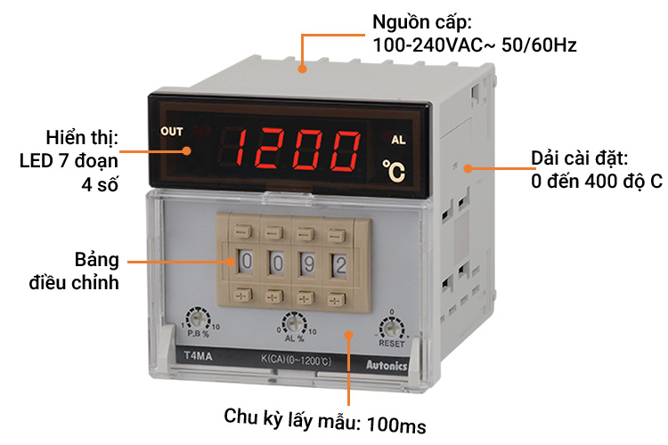 Bộ điều khiển nhiệt độ Autonics T4MA-B4RK4C-N gồm 4 phần chính.