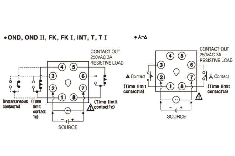 - Ngõ ra: Tiếp điểm: Time limit DPDT (2c), Time limit SPDT (1c) + Instantaneous SPDT (1c). Công suất tiếp điểm: tải thuần trở 250VAC 5A/3A