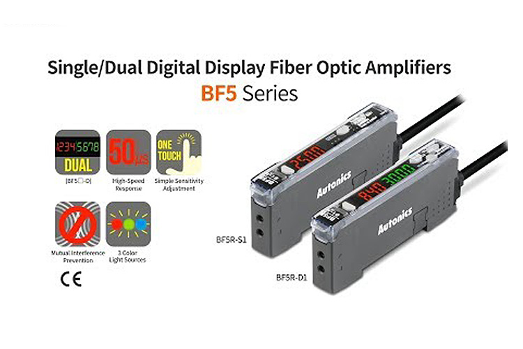 - Bộ khuyếch đại sợi quang Autonics BF5 series có dòng hiển thị kép giá trị cài đặt (BF5R-D) và mức nhận ánh sáng tới .