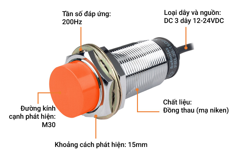 Cảm biến tròn 3 dây Autonics PRL30-15DP có 1 đầu cảm biến, 2 đai ốc và ren với các chức năng khác nhau: