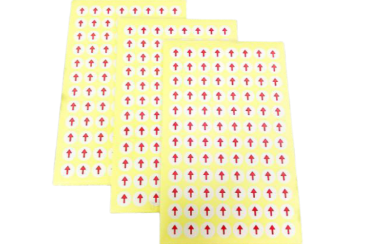 Tomy arrow decal 1cm round shape made from A5 decal paper. Each paper size is shaped into many circles with a pre-printed red arrow image measuring 10mm, just peel it off and stick it on any material surface thanks to the adhesive backing.