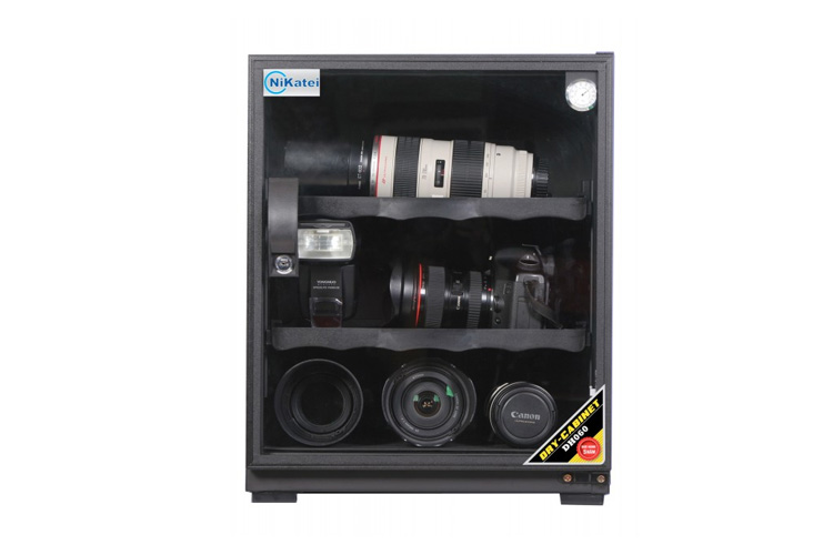 Nikatei anti-humidity cabinet has 3 compartments with 2-layer glass doors, scratch-resistant, strong, rubber gaskets surrounding the cabinet, so it is both durable and works very well, not afraid of dust or moisture from the outside entering the cabinet.