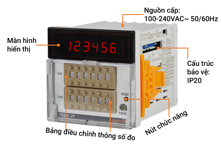 Bộ đếm Autonics FX6M-2P4 có màn hình LED 6 chữ số 7 đoạn hoạt động đếm lên, đếm ngược, đếm lên / xuống. Bộ đếm Autonics FX6M-2P4 Bảo vệ cấu trúc IP20 Dòng FXM có sẵn các tốc độ đếm 1 cps, 30 cps, 2 kcps và 5 kcps và các phạm vi cài đặt thời gian khác nhau cũng có sẵn cho chức năng hẹn giờ. Chế độ đếm lên, đếm ngược và đếm lên / xuống có sẵn để đo chính xác và hiển thị các cấu hình hệ thống khác nhau. Người dùng có thể dễ dàng chuyển đổi giữa các đầu vào NPN / PNP bằng cách sử dụng công tắc DIP kèm theo. Dòng FXM có sẵn ở các kiểu 4 chữ số, 6 chữ số và 8 chữ số với 2 kích thước DIN tiêu chuẩn (W 72 x H 72, W 48 x H 96 mm).