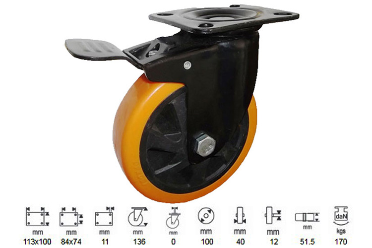 The Ethos 296UMH100P45 medium-duty 290 series PU wheel with brake has the ability to protect the floor well, the ability to move smoothly is suitable for factory environments, especially with epoxy painted floors. In addition, PU has low elasticity, so the wheel has good shock absorption and noise reduction, suitable for moving in environments that require quietness. The life of the wheel is estimated at about 2-5 years. Molded PU has a longer life.