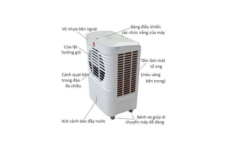 Vỏ ngoài của máy làm bằng nhựa cao cấp, có 4 bánh xe di chuyển. Chức năng đảo chiều gió trái/phải tự động, đảo chiều trên/dưới bằng tay giúp tản gió mát khắp phòng hiệu quả, làm giảm nhiệt độ phòng từ 5 - 10 độ so với nhiệt độ ngoài trời, mang lại luồng không khí mát mẻ, dễ chịu.