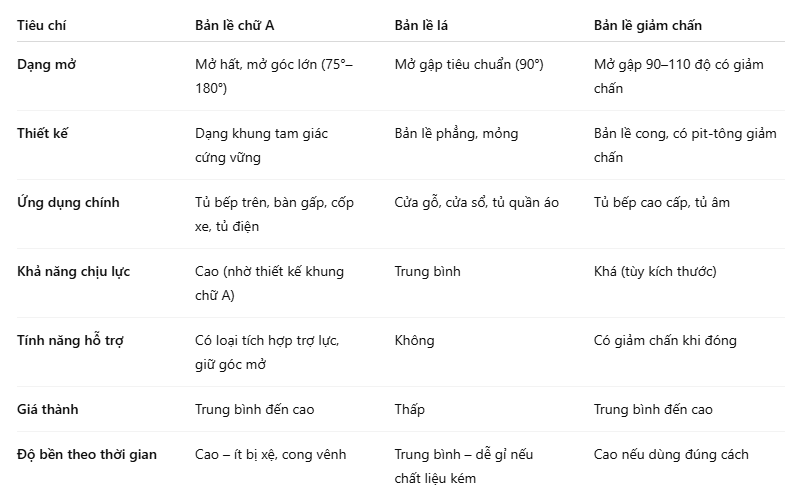 Trên thị trường hiện nay có rất nhiều loại bản lề, mỗi loại có thiết kế và công dụng riêng biệt. Để hiểu rõ bản lề chữ A có điểm gì nổi bật, dưới đây là bảng so sánh giữa bản lề chữ A với các loại bản lề phổ biến như bản lề lá và bản lề giảm chấn:
