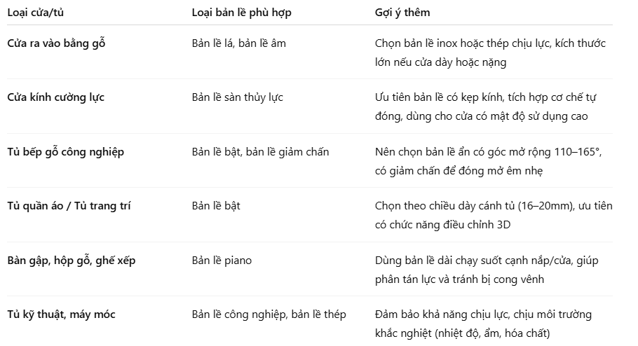 Việc lựa chọn bản lề phù hợp không chỉ đảm bảo tính thẩm mỹ mà còn giúp tăng độ bền, sự tiện lợi và an toàn cho công trình. Dưới đây là gợi ý cách chọn bản lề phù hợp dựa trên từng loại cửa, tủ thường gặp trong dân dụng và nội thất: