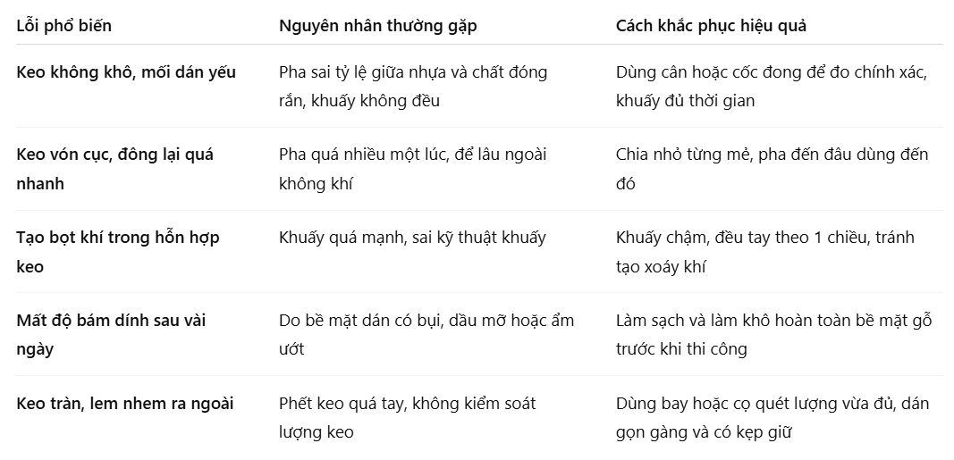 - Không khuấy quá mạnh tay hoặc dùng dụng cụ có dính nước – dễ làm loãng hoặc ảnh hưởng phản ứng hóa học trong keo.