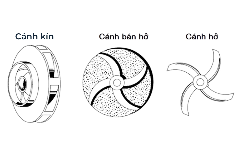 Hiện nay có 6 loại cánh quạt phổ biến: cánh kín, cánh hở, cánh bán hở, cánh trục vít, cánh chân vịt và cánh cắt. Mỗi loại phù hợp với từng môi trường khác nhau như nước sạch, nước thải, nước có cặn hoặc rác.